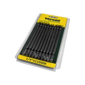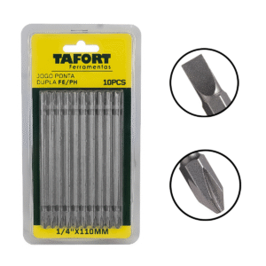 O Jogo Bits Ponta Dupla Fenda e Philips 110mm 10pç Pra Parafusadeira da TAFORT é um conjunto prático e versátil, voltado para quem busca precisão, durabilidade e rapidez em operações de parafusamento. Composto por 10 pontas idênticas, cada peça apresenta duas extremidades — uma fenda e uma Philips — eliminando a necessidade de trocar a ponteira durante o trabalho. O encaixe hexagonal de 1/4” (6,35 mm) é compatível com a grande maioria de chaves manuais e parafusadeiras elétricas, enquanto o comprimento total de 110 mm garante alcance estendido, perfeito para acessos em locais profundos ou de difícil visualização. Fabricadas em Aço Cromo Vanádio (Cr-V) com tratamento térmico e acabamento fosfatizado, estas pontas oferecem excelente resistência ao desgaste, à corrosão e mantêm o perfil original mesmo sob altas cargas de torque.